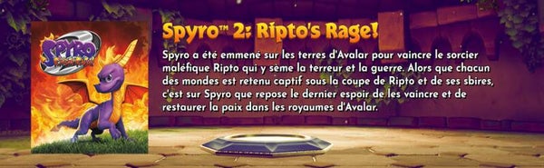 Spyro™ 2: Ripto's Rage! et Spyro™: Year of the Dragon, tous intégralement remasterisés. Explorez les niveaux gigantesques, retrouvez des personnages inoubliables et revivez toutes ces aventures remasterisées en haute définition. Quand il y a un royaume à sauver, il n'y a qu'un seul dragon à appeler à la rescousse.