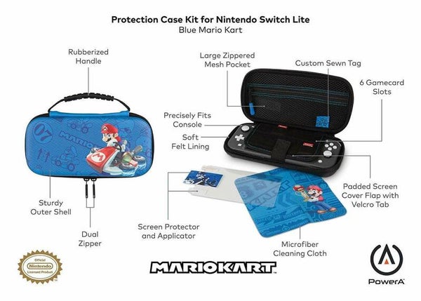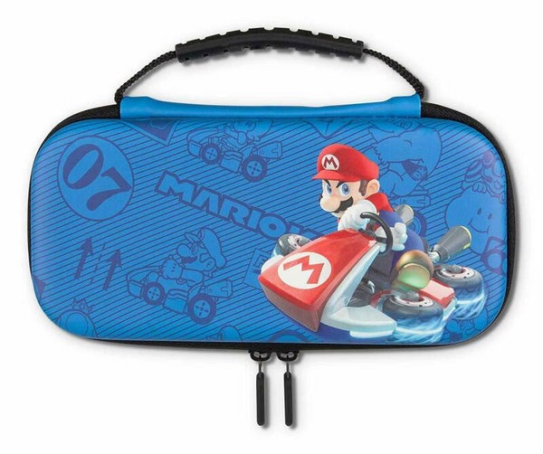 Ce boîtier robuste au design Mario Kart bleu offre un espace de rangement sécuritaire et une protection pour votre Nintendo Switch Lite. À l'intérieur, vous trouverez un revêtement en feutre et de l'espace de rangement pour six cartes de jeu et deux cartes microSD, sans oublier une poche en filet avec fermeture Éclair.